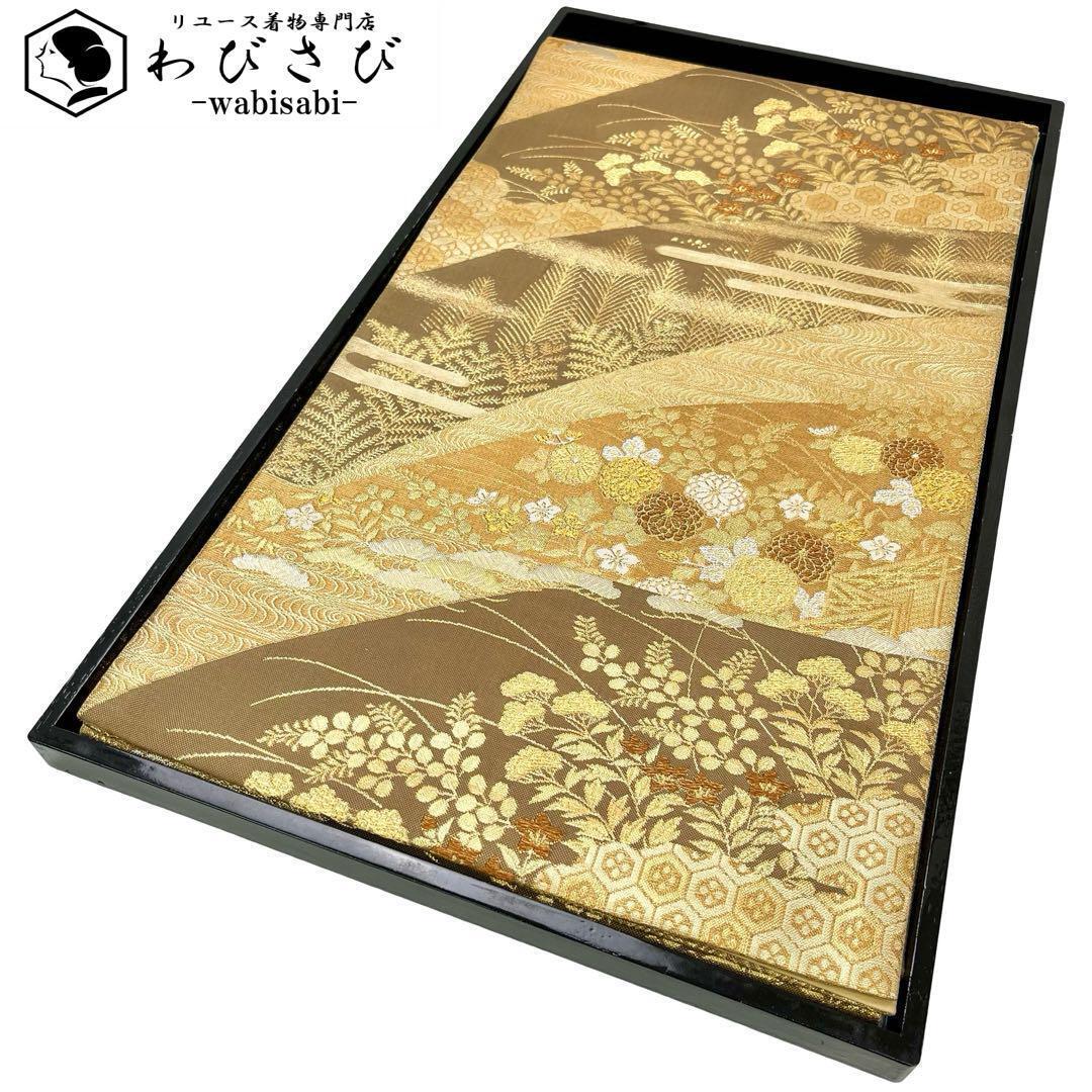 > 袋帯 花草模様 金銀糸 錆利休色 O-4065 着物 きもの kimono 和服 和装 中古 リサイクル着物 【送料無料】