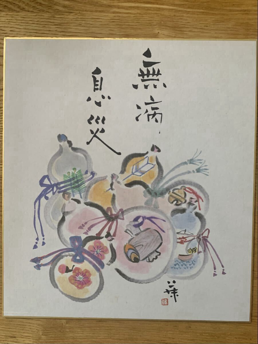 - 模写 色紙絵 宇野藤雄 画 無病息災 色紙 水彩画 ひょうたん 打ち出の小槌 松 梅 鈴 宝船 縁起物 健康 アート