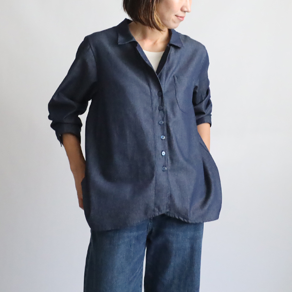 - 秋SALE 甘織デニム 変形ボタン ライン ラウンド裾 ヘム ライン シャツ ジャケット 前開き インディゴ R91