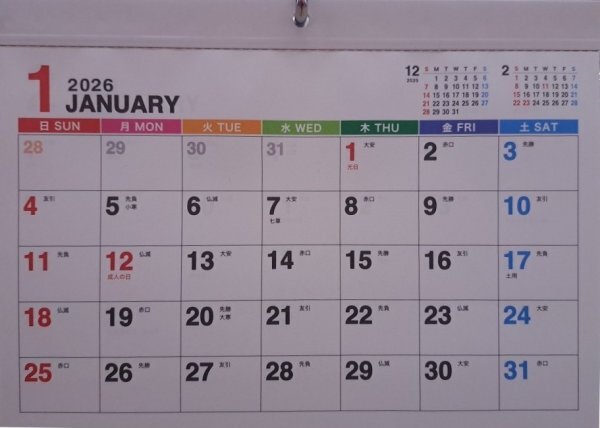 - 【1冊:カラー カラフル 横 カレンダー:A4:30X21cm】★見やすい 大文字 ★2026年★壁掛け:こよみ:暦:六曜:No4dy