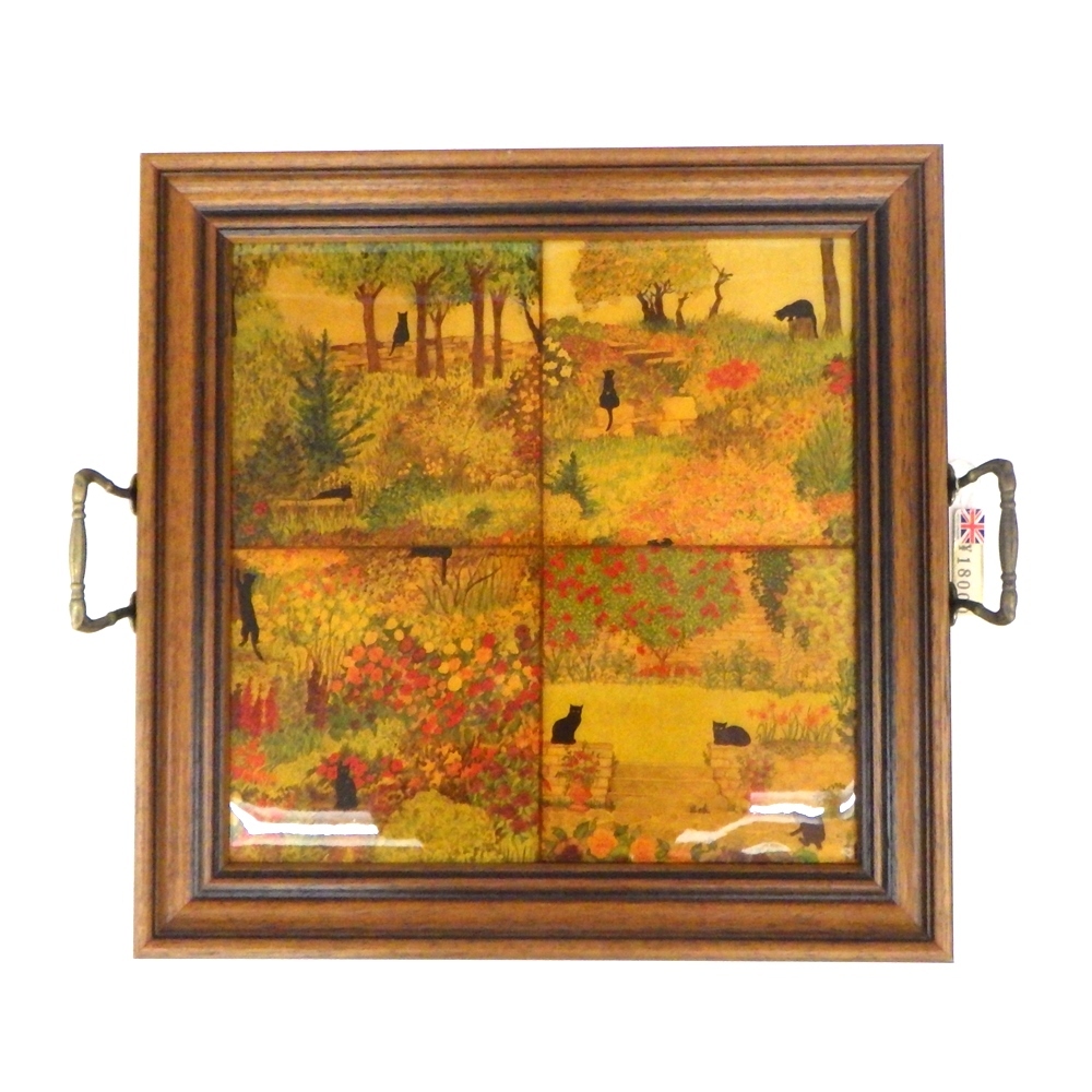 - SI-136 ティートレイ タイルトレー お盆 木製フレーム 黒猫 39cm イギリス アンティークショップ保管品 ヴィンテージ 輸入雑貨