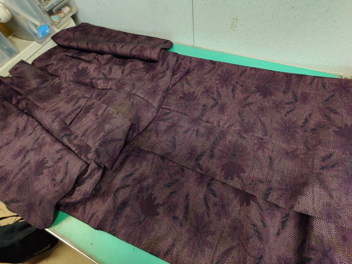 > ●158 レトロ モダン 粋な 紫 ワイン カラー 花 模様 オシャレ アンティーク 紬 着物 ①