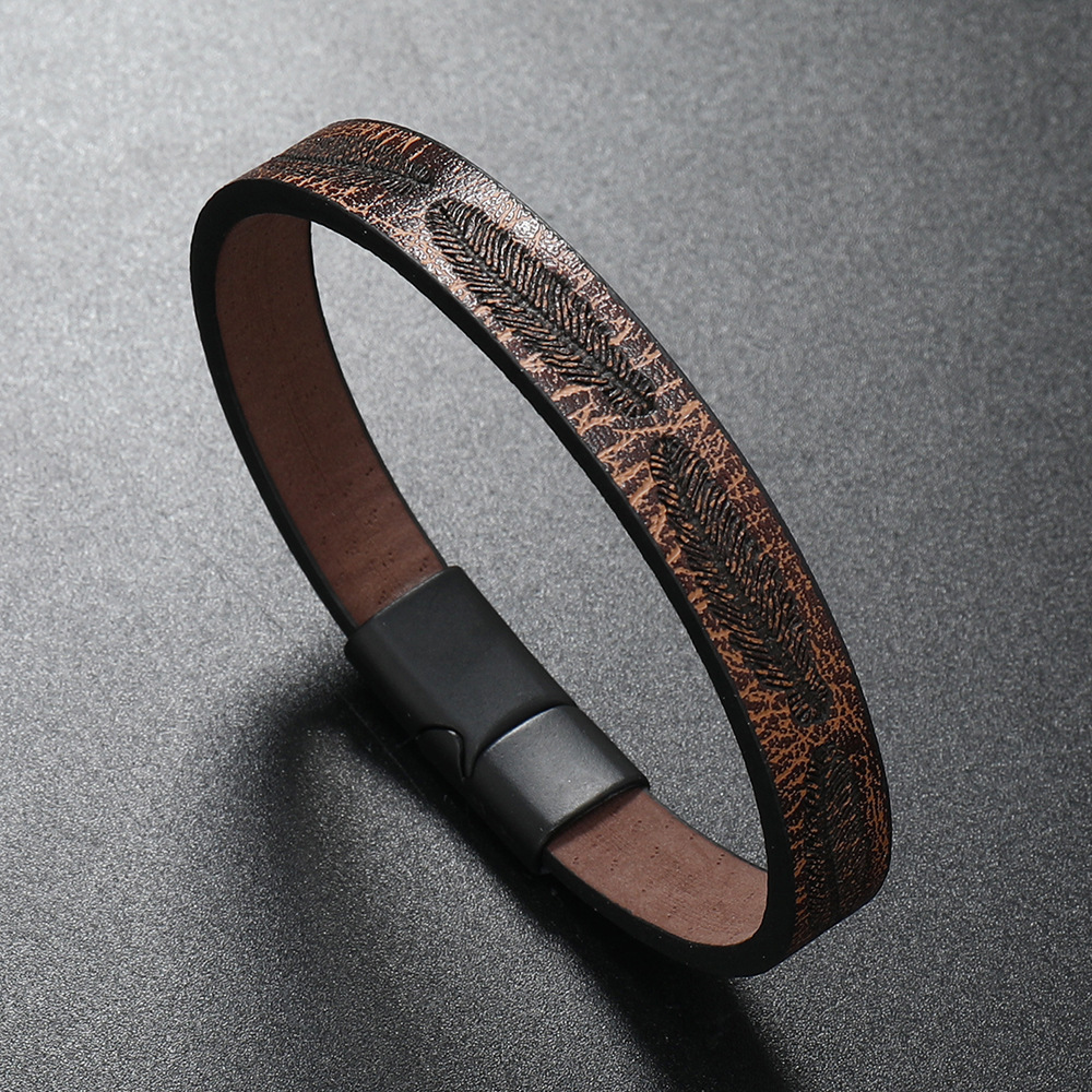 - 【ブラウン】メンズ 革 ブレスレット ヴィンテージ風 レトロ バングル アクセサリー 羽 ブラック