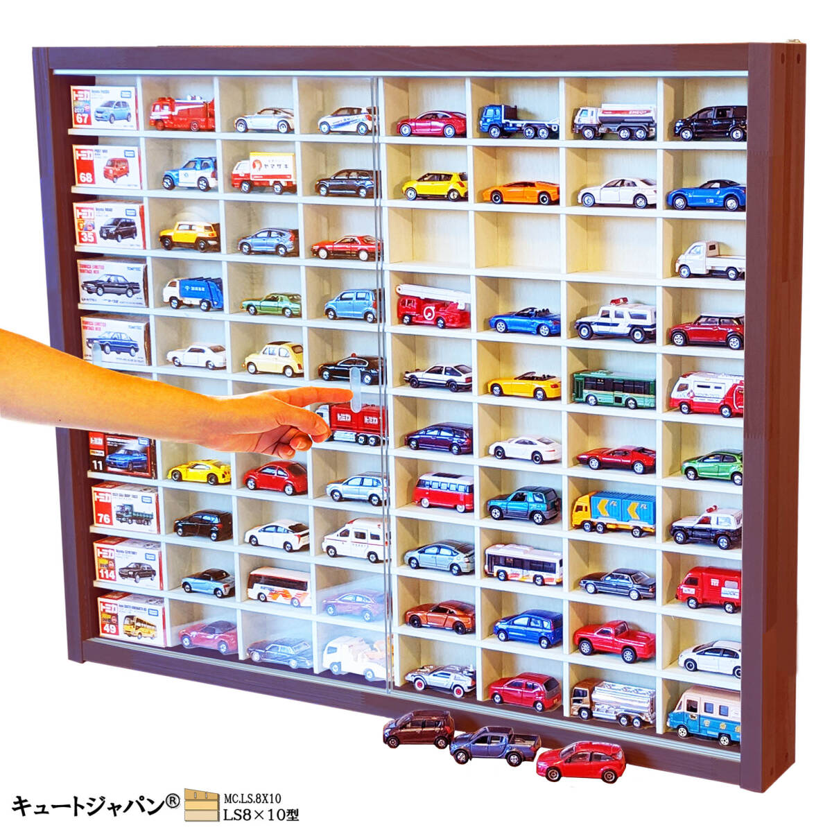 - 送料無料★【1/64ミニカーケース木製】80台 コレクション ディスプレイ 棚 アクリル障子付 マホガニ色塗装 日本製 LS8×10型