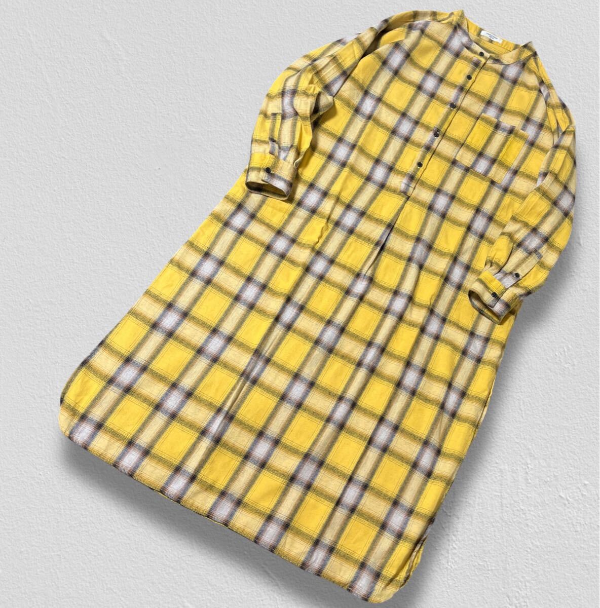 - FREAK'S STORE 長袖ロングシャツワンピース イエローチェック柄 フリーサイズ●洗濯プレス済●フリークスストア シャツワンピ秋冬 古着/611