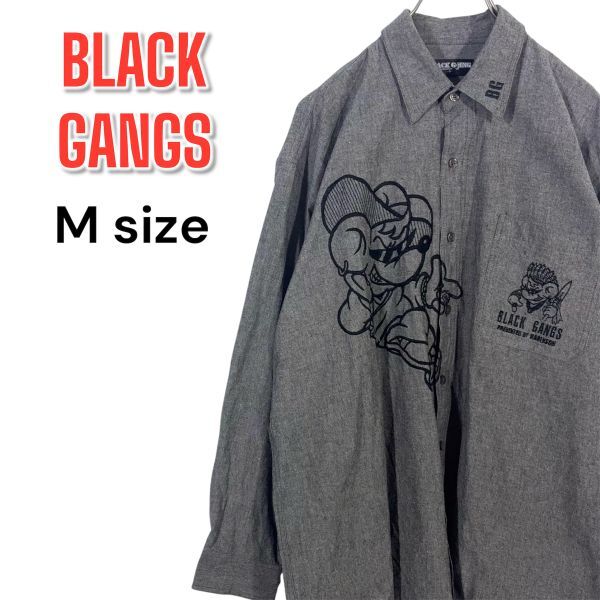 - 90s BLACK GANGS シャンブレーシャツ グレー Mサイズ キャラ刺繍