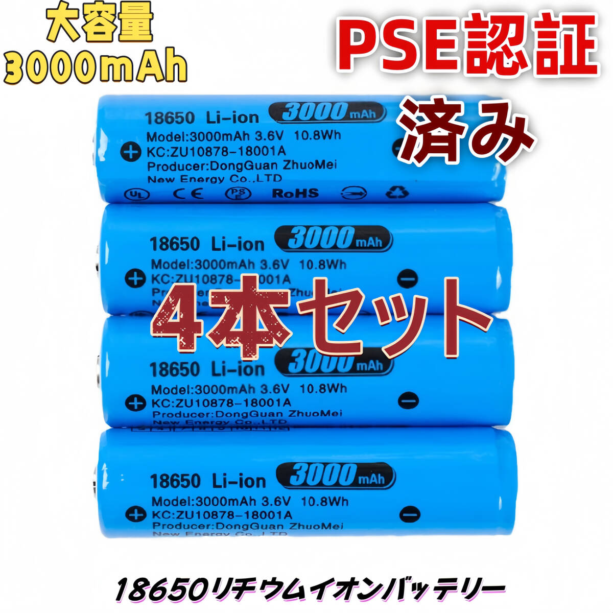 - 【4本セット】18650 リチウムイオン電池 バッテリー 大容量 3000mAh 3.6V 保護回路付 突起有り PSE認証済み