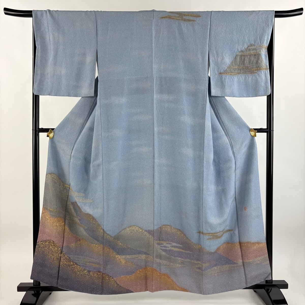 > 訪問着 身丈158cm 裄丈68cm L 袷 翠山工房 落款 霞 山並み 金彩 絞り 水色 正絹 秀品 【中古】