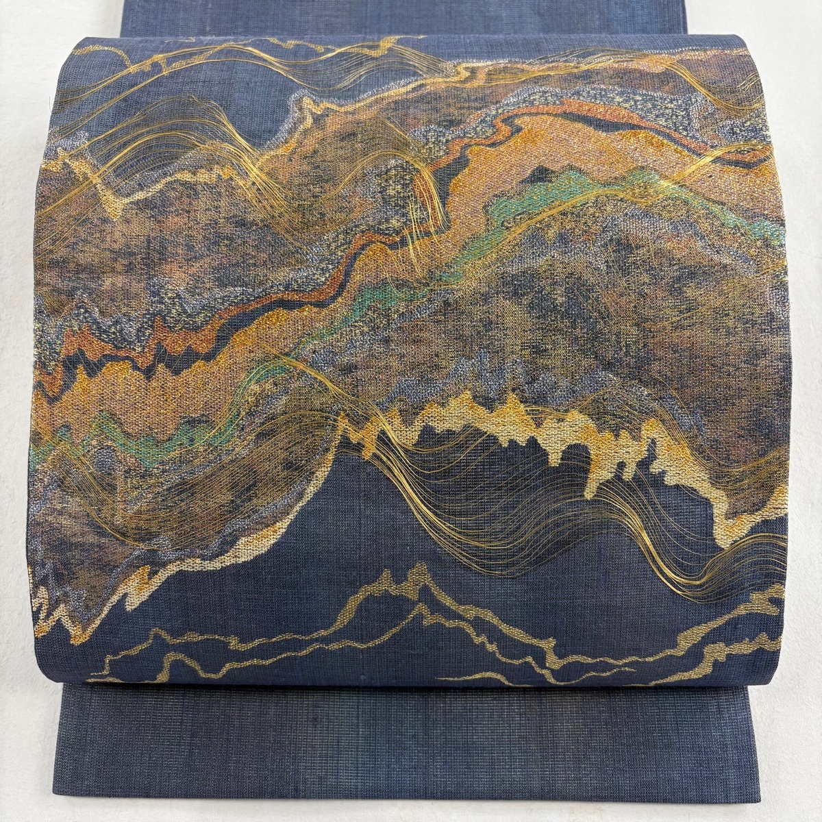 - 袋帯 美品 名品 霞 金糸 箔 青灰色 お太鼓柄 正絹 【中古】