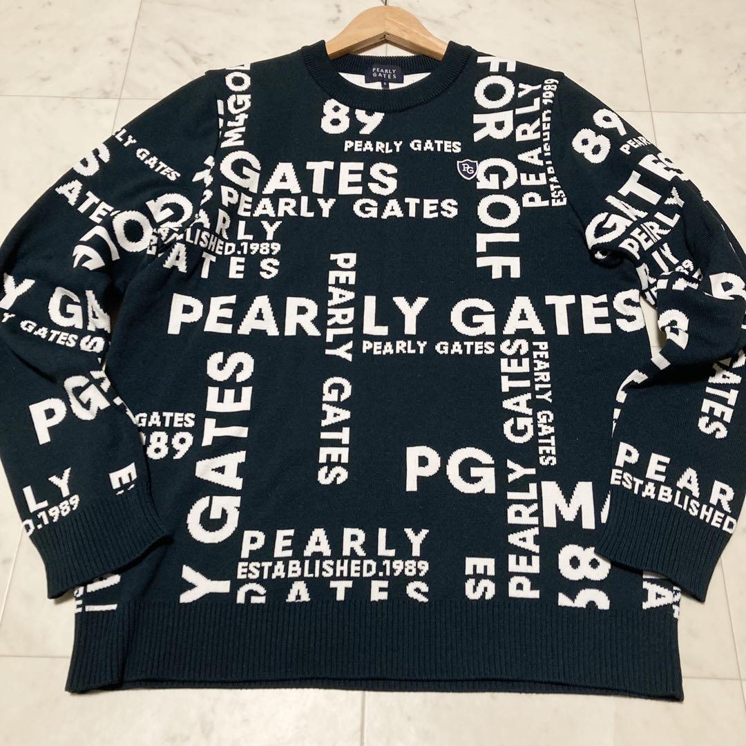 > 未使用に近い/サイズ6●パーリーゲイツ ニット PEARLY GATES 総柄 セーター ワッペン 刺繍 ロゴ ネイビー XL ゴルフ メンズ