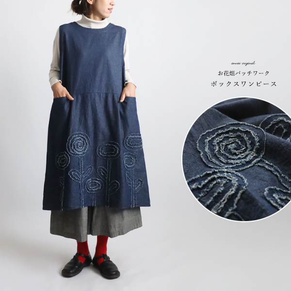 - 芸術の秋SALE 110cm花畑パッチワーク かぶるだけワンピース ジャンスカ ボックスOP 甘織デニム G80