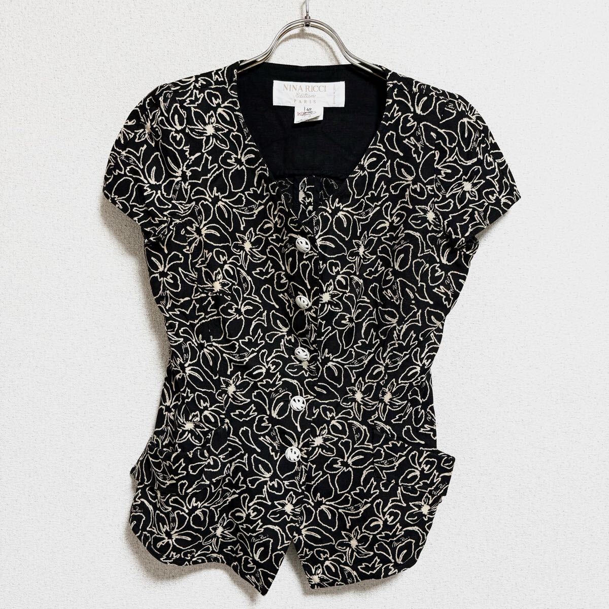 > NINA RICCI ニナリッチ ブラウス カットソー フレンチスリーブ 総柄 シャツ ノーカラー レディース ブラック系 サイズ 42 *DD