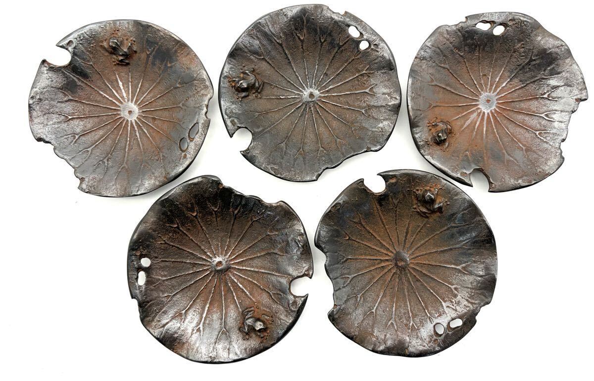 - 蓮に蛙 高岡銅器 虫食い 焼朱 茶托 5枚 最大直径約10cm 合計総重量約725g 銅茶托 ヴィンテージ