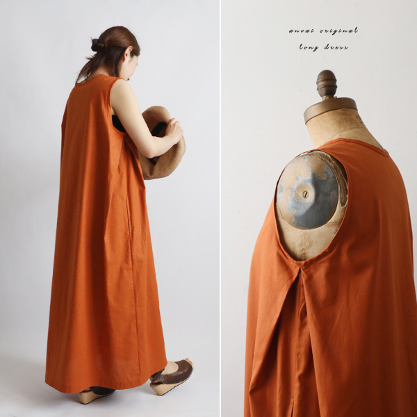 - 最終SALE 125cm ギマ擬麻コットン脇下タック入ロング ワンピース ドレス オレンジ R61