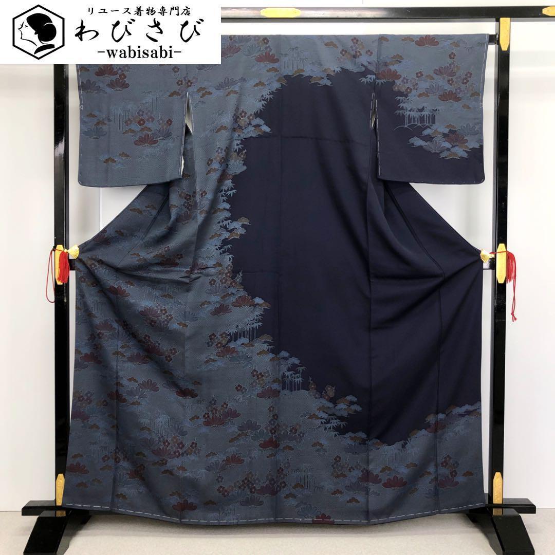 - 訪問着 松竹梅 鹿の子柄 濃紺色 しつけ糸 トールサイズ K-2447 着物 きもの kimono 和服 和装 中古 リサイクル着物 【送料無料】