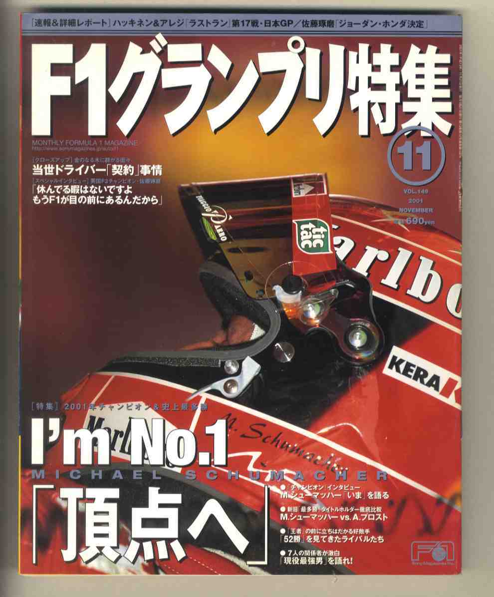 書名/記事: 01.11 F1グランプリ特集/特集=2001年チャンピオン&史上最多勝 M・シューマッハー、当世ドライバー契約事情、第17戦 日本GP、佐藤琢磨・ジョーダンホンダ決定、…