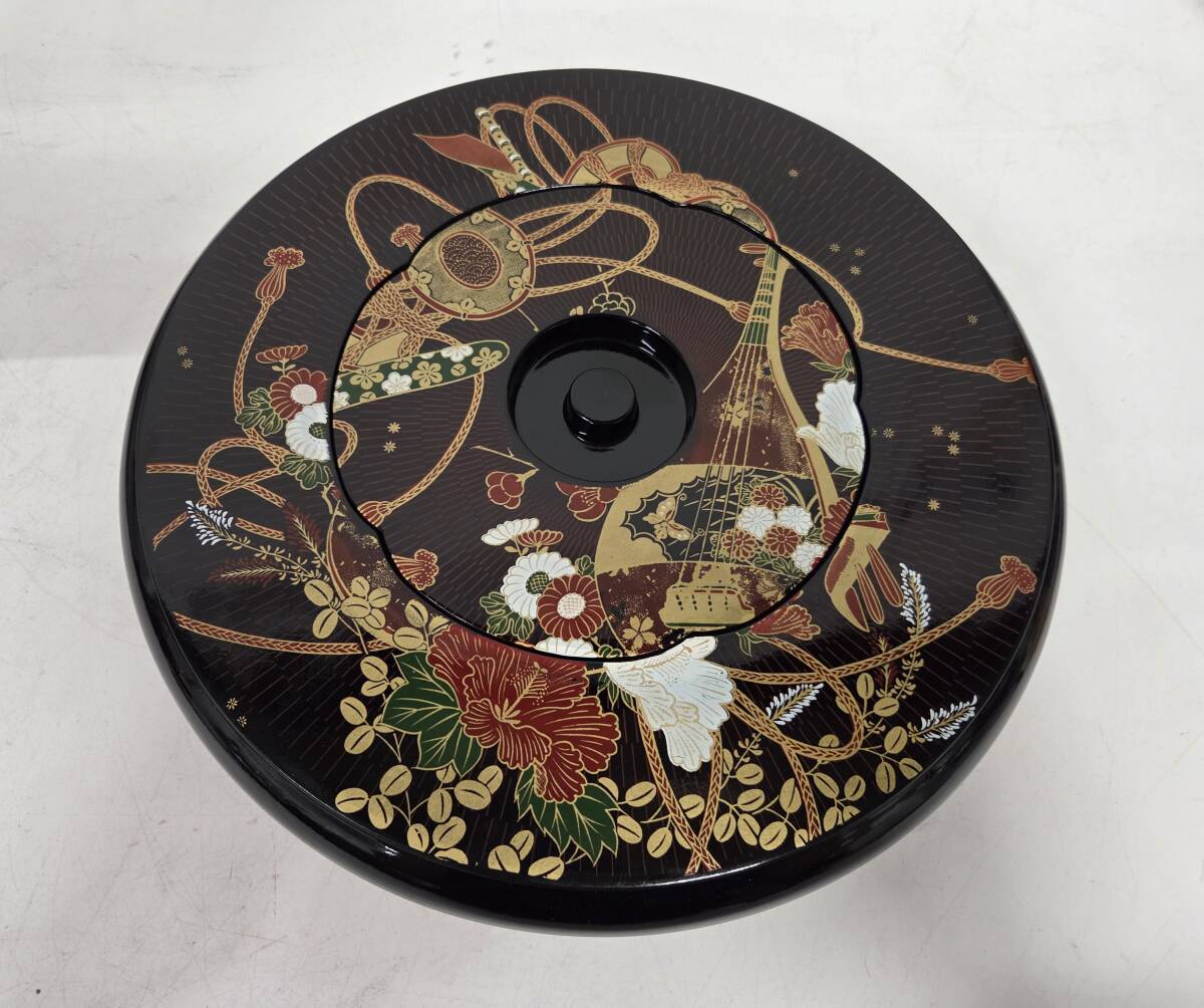 - 【美品】1段重箱 すし桶 ちらし寿司 和食器 レトロ 花柄 漆器 直径 約29cm 高さ 約5cm 蓋あり高さ 約7cm 0910-01(8)