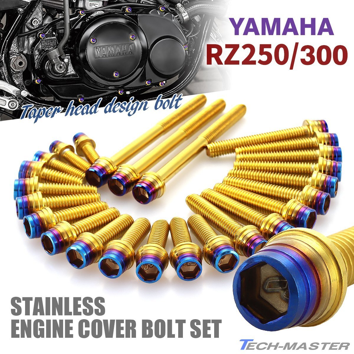 - RZ250 RZ350 エンジンカバー クランクケース ボルト 25本セット ステンレス製 テーパーシェルヘッド ゴールド×焼きチタンカラー TB7182