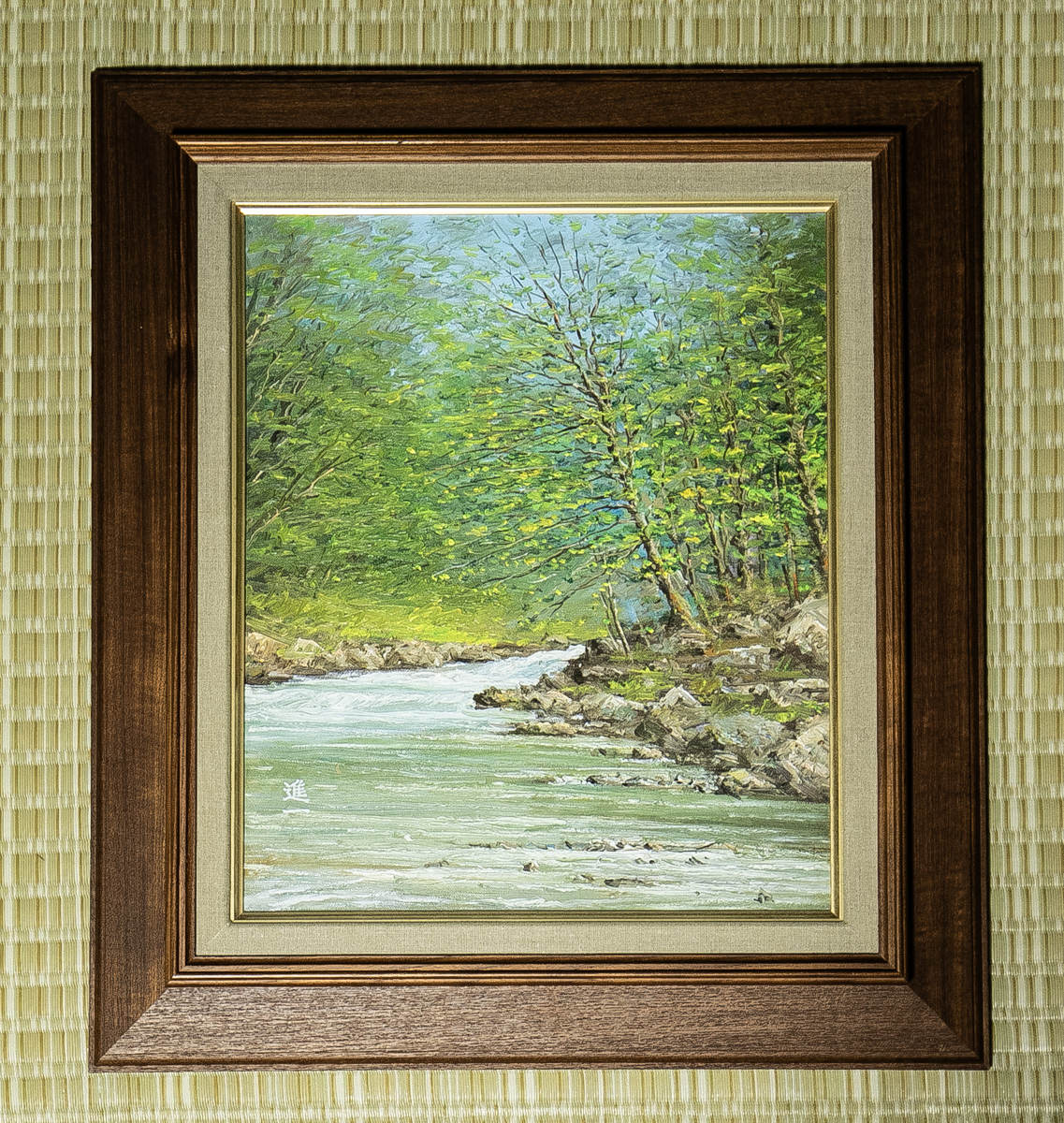 - 3273【真作】 本松進一 新緑の流れ(信州) 裏に自署