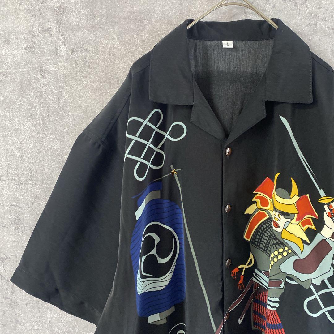 - 武士デザイン 和柄シャツ 半袖 オープンカラー オーバーサイズ 黒 Lサイズ
