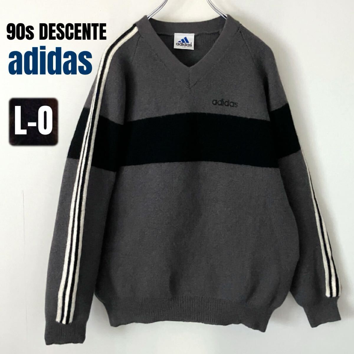 - 90sデサント製アディダス★スリーストライプス★V首ウールセーター★DESCENTE adidas★メンズL-O