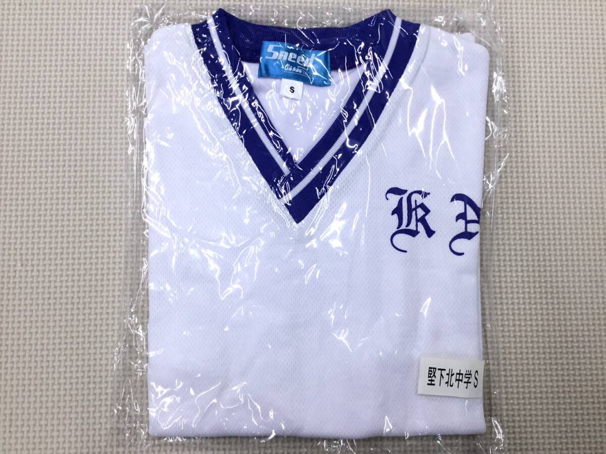 > S1494 新品【堅下北中学校】(旧)スクールスポーツウェア サイズ S /SneedSanwa/半袖/V衿/白x青/男女兼用/中学生/指定/小さめサイズ
