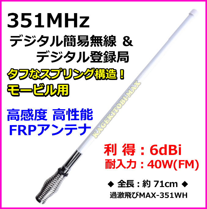 - 351MHz帯 デジタル簡易無線専用 強靭設計 モービル用 アンテナ 新品 広帯域受信対応 FRP構造 / 車載型 基台 同軸ケーブルに♪過激飛びMAX