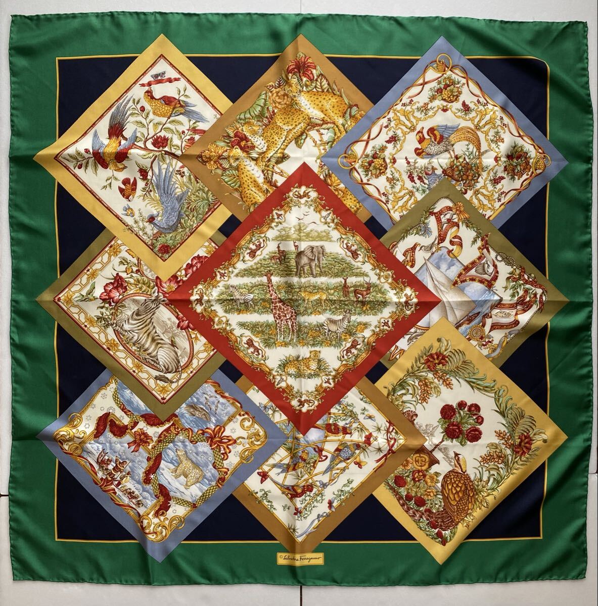 - 極美品◆Salvatore Ferragamo サルヴァトーレフェラガモ アニマル柄 シルク 大判スカーフ グリーン マルチカラー