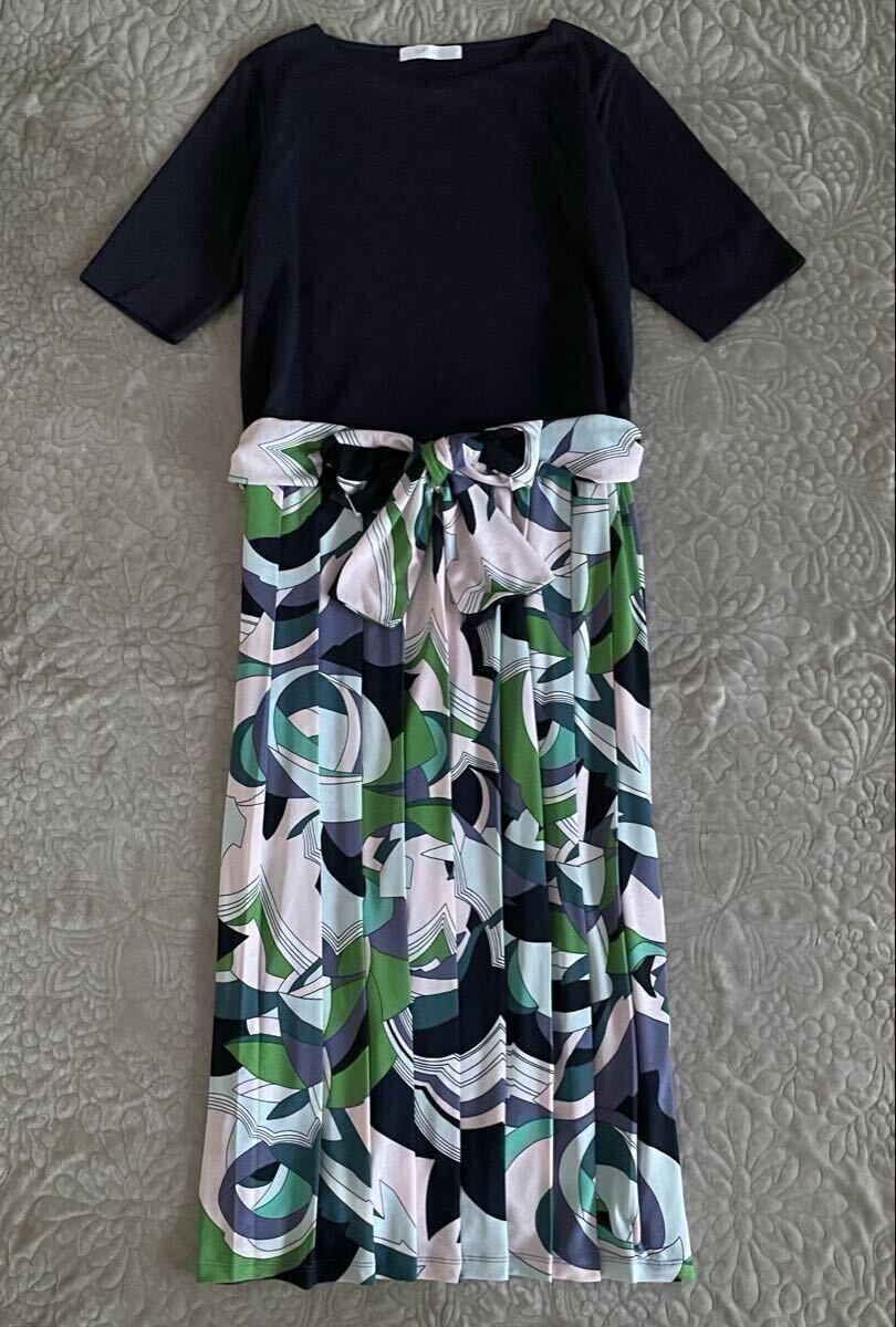 > ドゥクラッセ ドッキング ワンピース 半袖 紺 綿100% コットン プルオーバー 緑 ピンク エミリオプッチ風 ロング プリーツ L