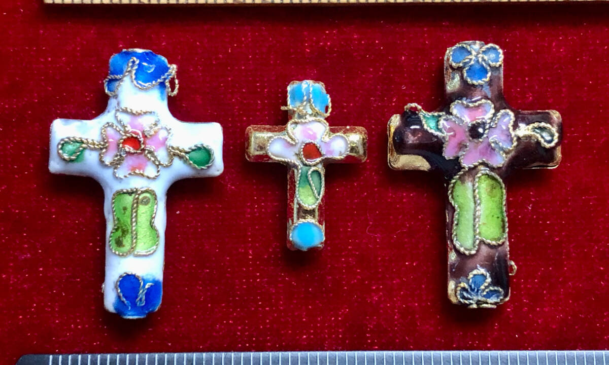- ¶!¶ 有線七宝焼ワールド - 3色(個)の十字型ペンダントで1単位 ¶!¶ 金線に三色釉ピンク花十字架 手作 手芸 工芸 インテリアペンダント