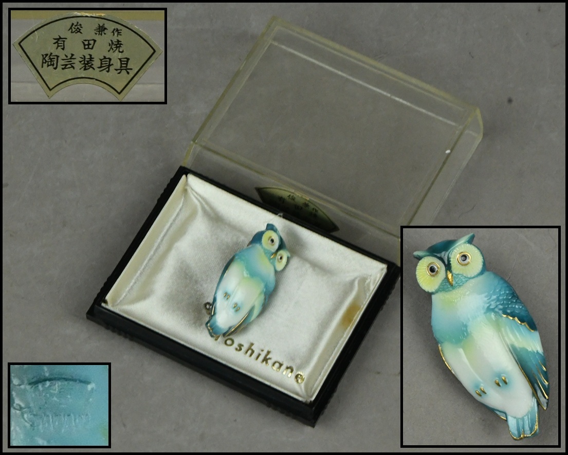 > 【NNK】有田焼『幻の超絶技巧』俊兼作【トシカネジュエリー】陶器製 細密 梟細工 ブローチ アクセサリー 装身具 ③ D7-909-3