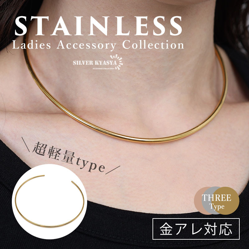 - (シルバー) チョーカー ネックレス レディース ステンレス メタルチョーカー 軽い プレーン 女性 金アレ対応