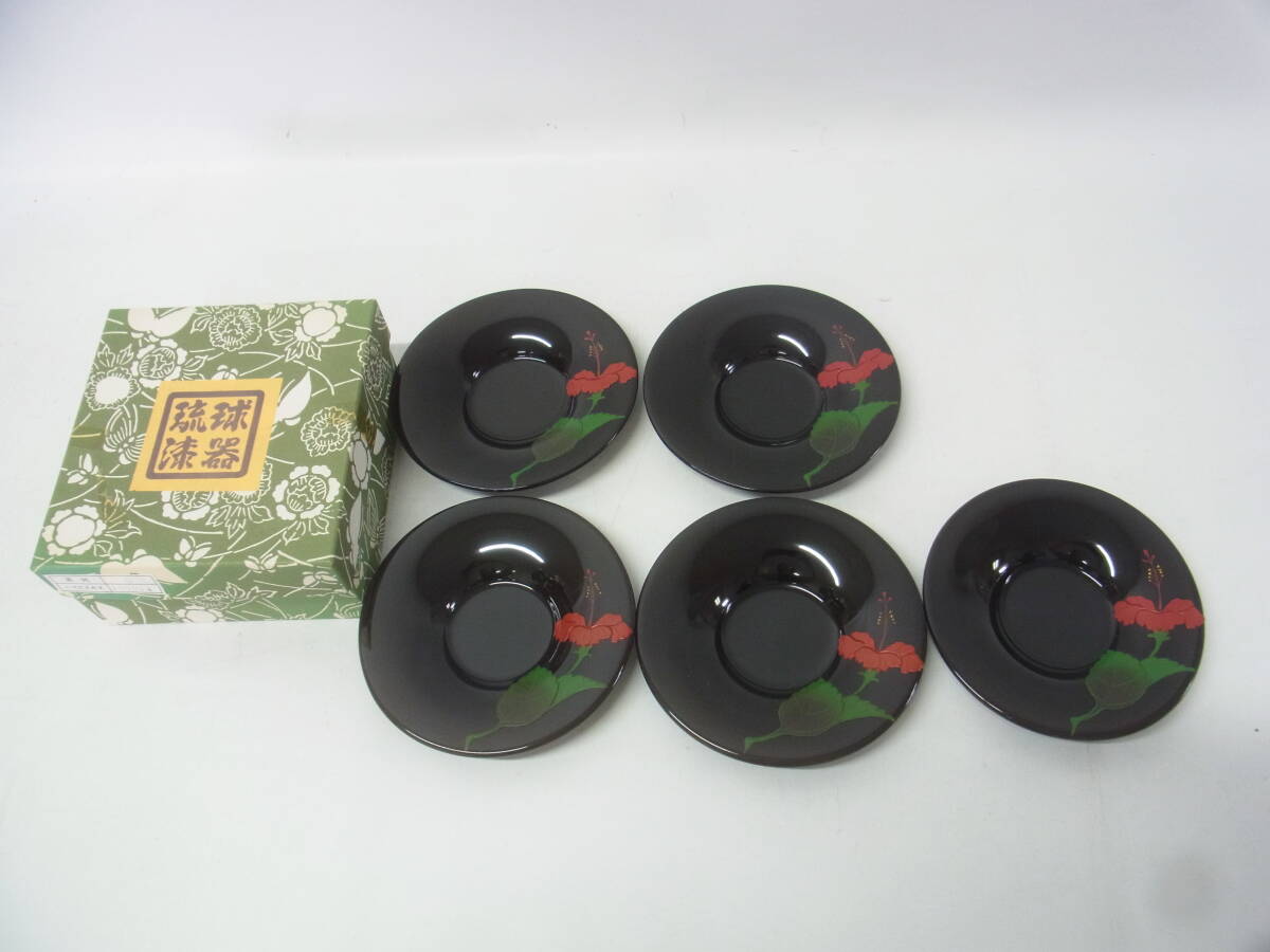 - ▲沖縄 琉球漆器 茶托 ハイビスカス うるし 漆器 漆芸 花 5客セット 箱入り 昭和 レトロ 保管品 ▲60