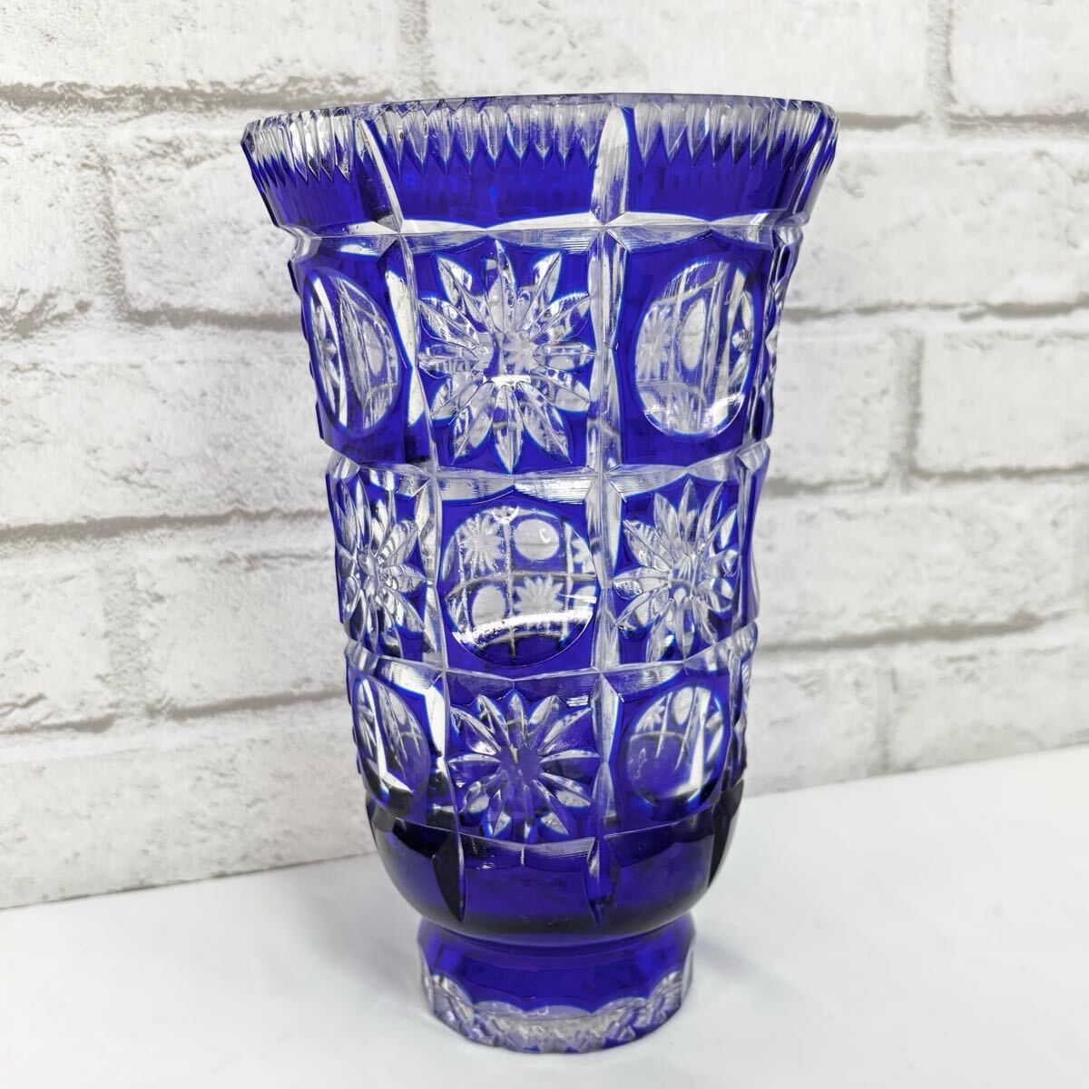 - 【カットガラス 花瓶】瑠璃色 ポーランド風 Polonia風 ポロニア風 模様入り 高さ約20cm フラワーベース
