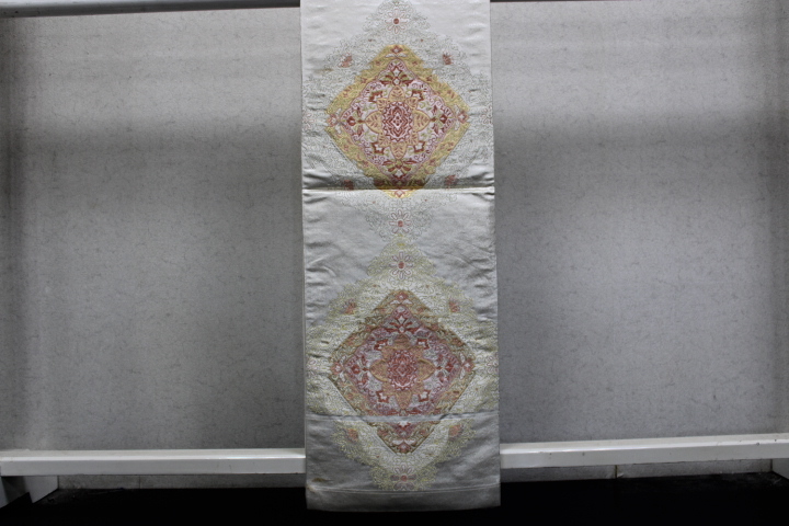 > きもの今昔8976 袋帯 西陣織正絹錦織 銀色地に菱形装飾華文柄 未仕立てですが既に使用してます