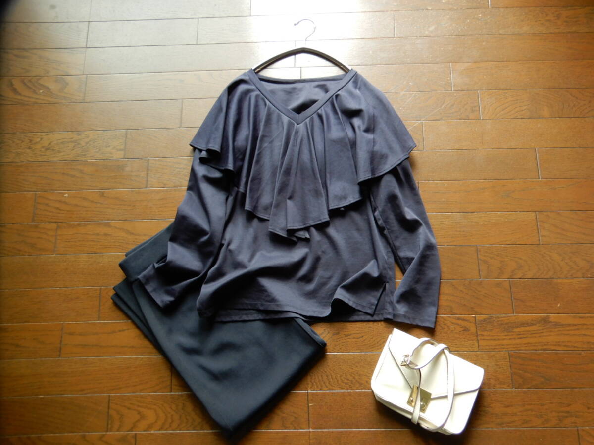 - 【PLST/プラステ】大人可愛いボリュームフリルエリプルオーバー Vネックコットン長袖カットソー ネイビー M
