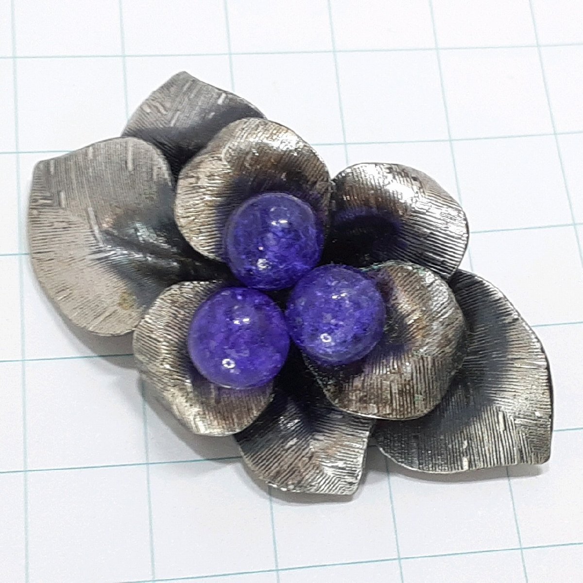 - 送料無料)ビンテージ☆クロームシルバー ブルー☆アンティーク ブローチ A32027