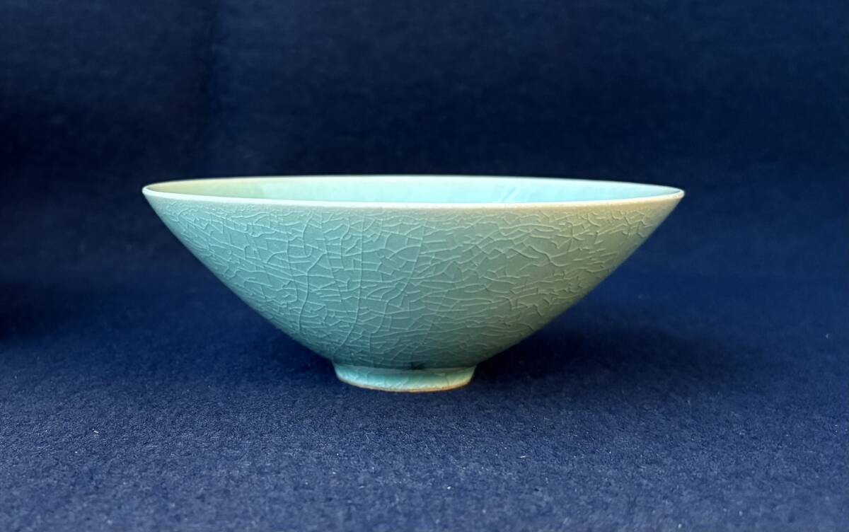 - 高麗青磁 茶碗 在銘「泉」 共箱・取扱説明書 箱書き 如泉青磁研究所 陶芸作家ーー李連休 陰刻花紋 青磁 韓国 焼物 茶道具 茶器