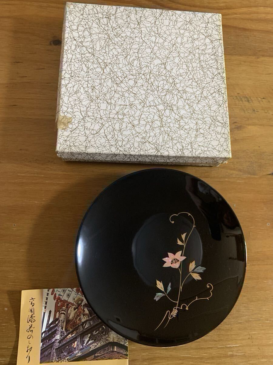 - 高岡漆器 貝入鉄仙 螺鈿 漆器 黒 菓子器 皿 直径24㎝ トレー 漆芸 蒔絵 伝統工芸 菓子皿 和食器