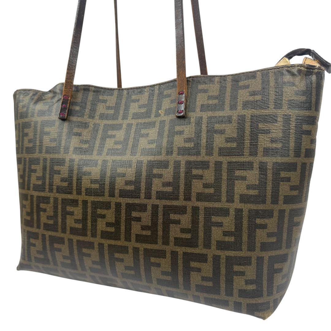 - 【A4対応】FENDI フェンディ 大容量 ズッカ柄 トートバッグ ハンドバッグ PVC レザー 肩掛け可能 カバン FFロゴ カーキ系 ブラウン系
