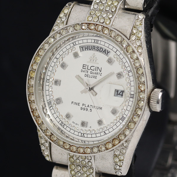 - エルジン FK-971-E FINE PLATINUM 999.5 QZ シルバー文字盤 石付 ダイヤベゼル デイト メンズ腕時計 KRH 2000000 NSK