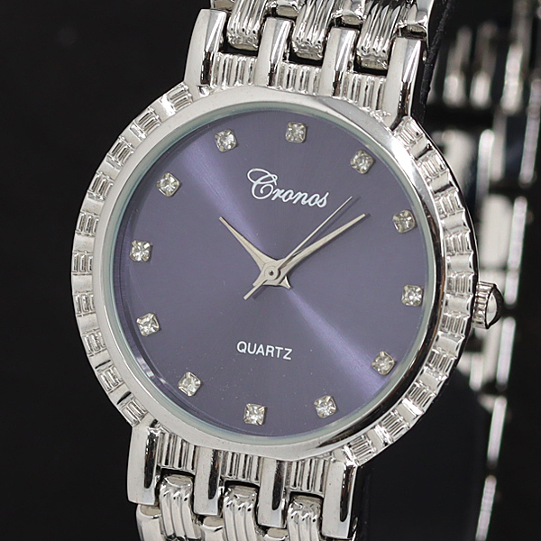 - 稼働 良品 クロノス QZ 紫文字盤 ラウンド 石付 シルバー メンズ腕時計 2000000 NSK OMI