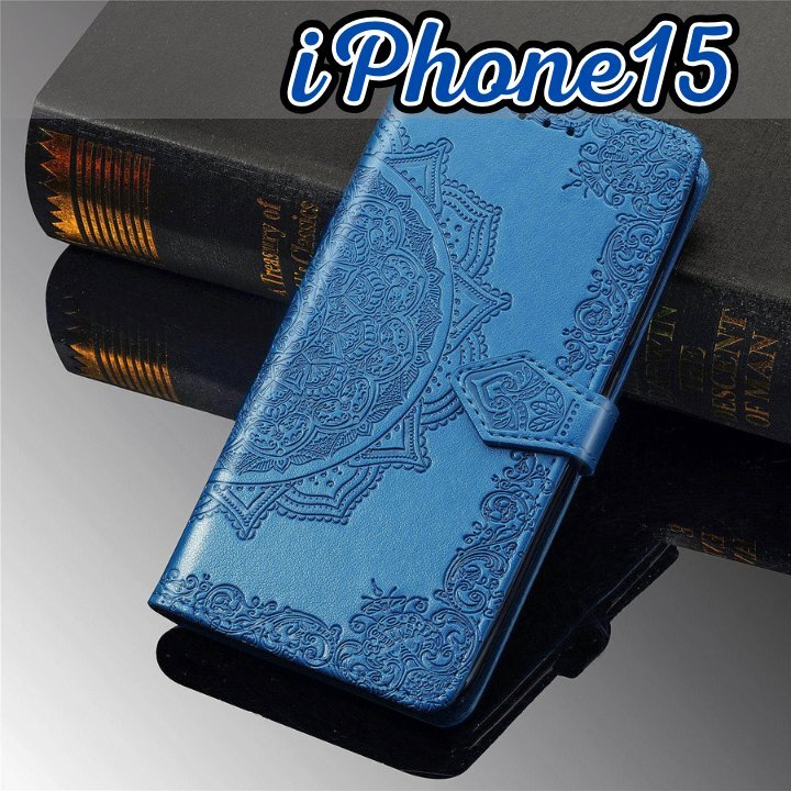 > iPhone15 曼陀羅 PUレザー型押し ブルー ケース 手帳型 可愛い カード収納&スタンド機能付き