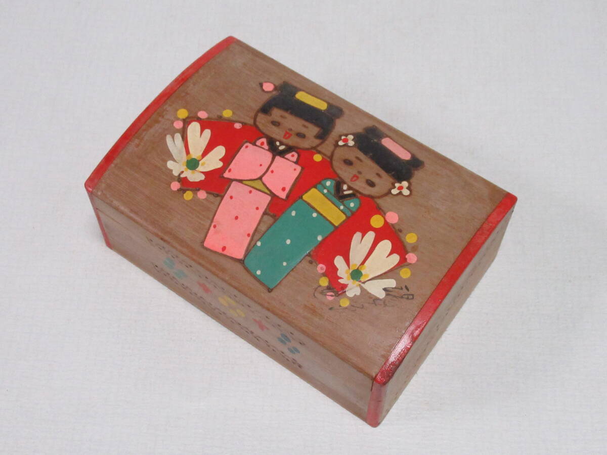 - 昭和レトロ 湯河原温泉 木製 かまぼこ型 可愛い 女の子の柄 こけし柄 小物入 小箱 ミニ鏡台/温泉みやげ/木工/アンティーク 観光土産 日本製