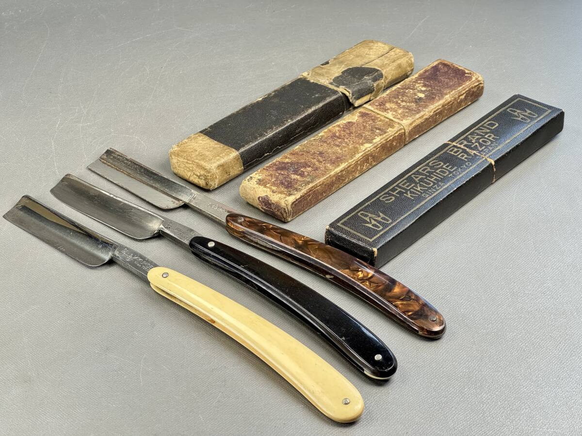 - 【偲】カミソリ 鯨歯風 天然白材 ストレートレザー 折りたたみ式 「菊秀」 3本セット 西洋剃刀 ひげ剃り 理容 シェービング r-830