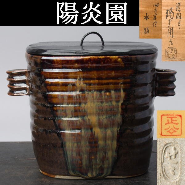 > 【千g773】膳所焼 陽炎園 四方耳付 水指 高さ約17.5cm 共箱 正公 塗蓋 膳所 淡海ぜぜ 茶道具