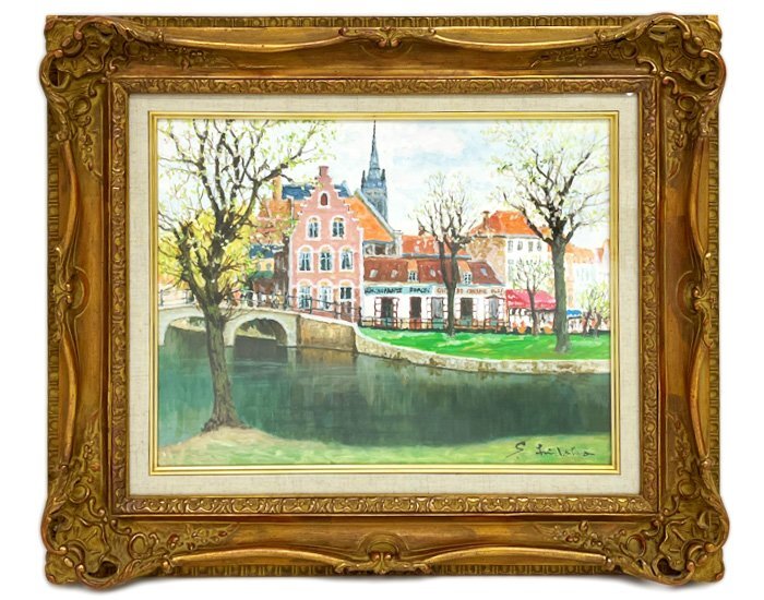 - 真作 日高蔀 F6号 「早春・ブルージュ」 油彩 油絵 絵画 洋画 アート 画家 日本作家 画伯 芸術 美術 風景 景色 額縁 額装 裏書サイン有