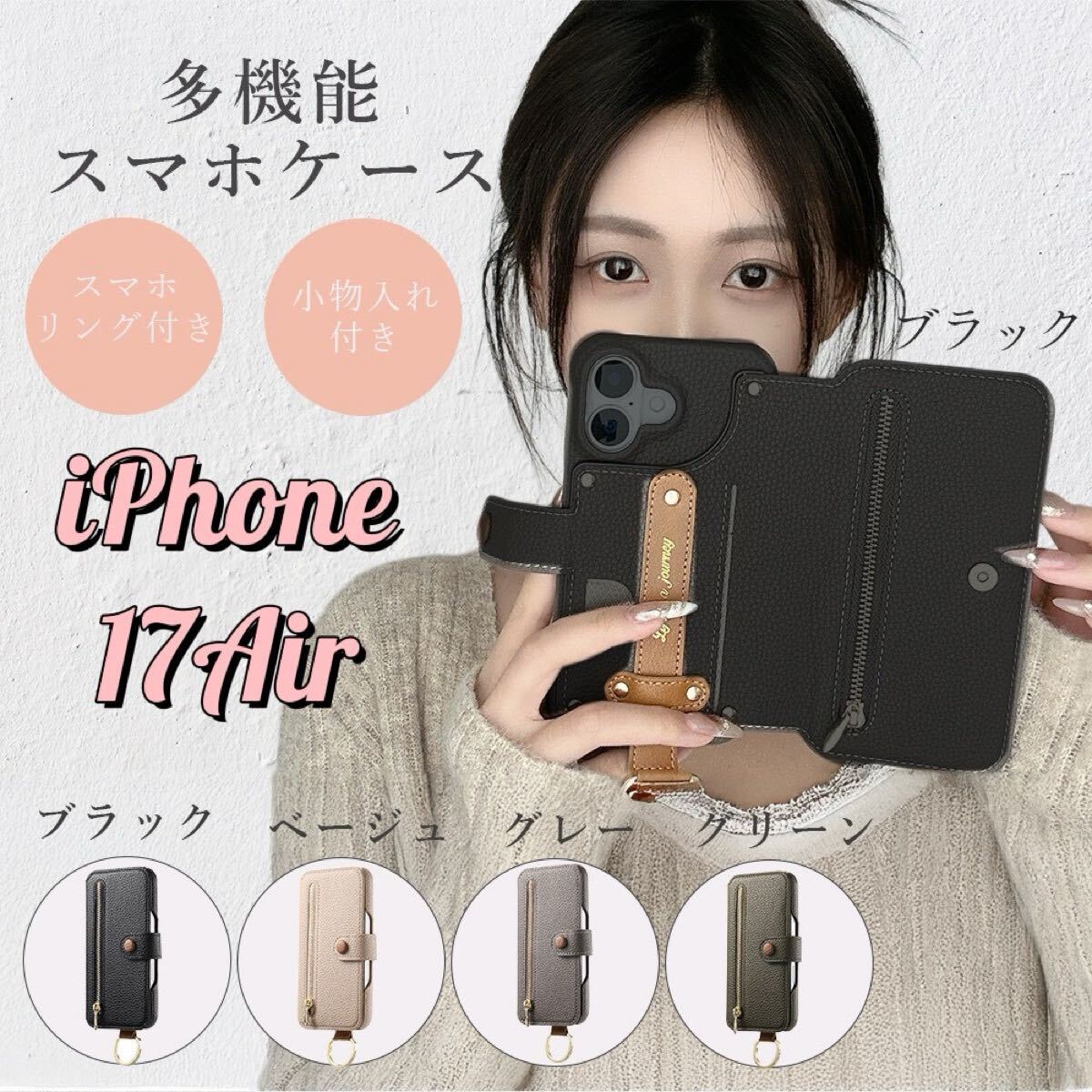 - 新品!大人気!!iPhone17Air ケース ブラック スマホカバー ベルト付き カード収納