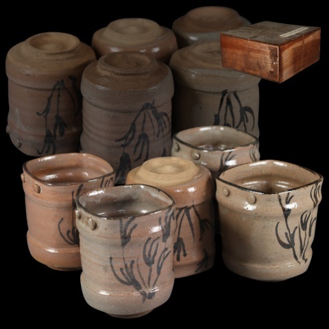 - 蔵出し品 古唐津 江戸期 絵唐津 筒形向付 5客 A652