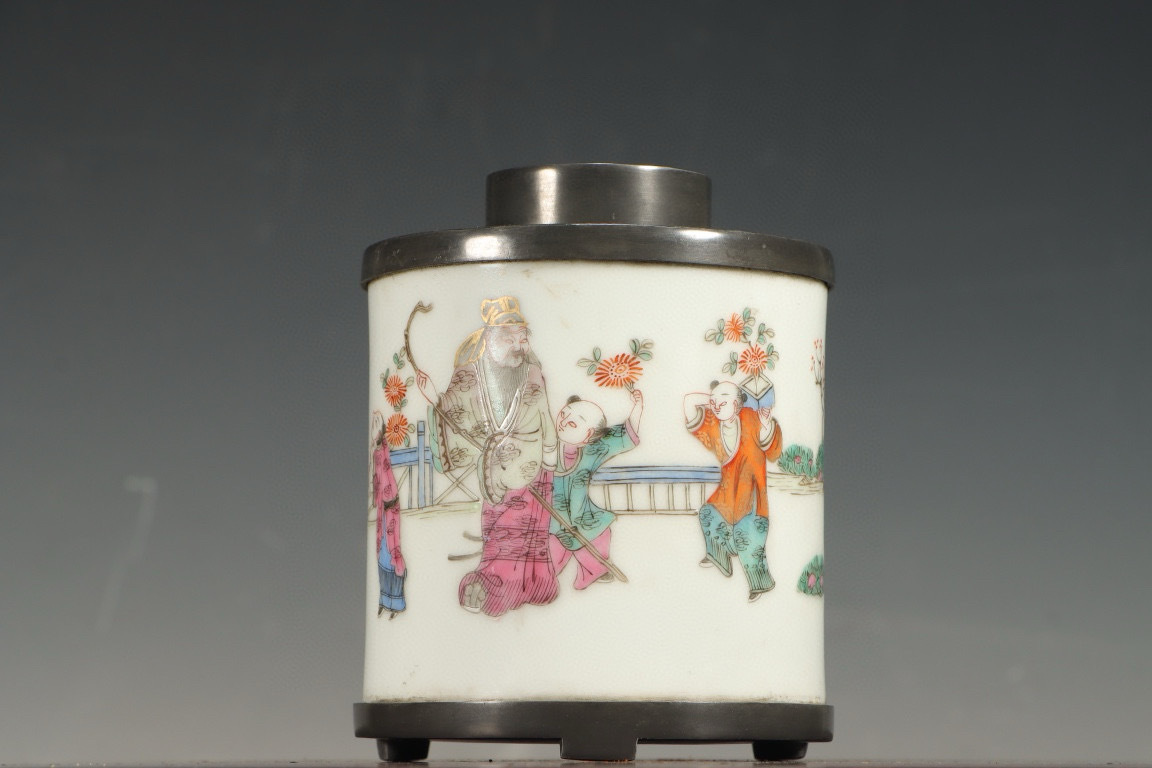 - 『古』【提点清老 造 粉彩 錫制 茶葉罐】重量927g 古錫斑 山水 詩文彫刻 茶道具 時代物 茶筒 茶入 高仕図 仕女図 錫 茶叶罐 古錫